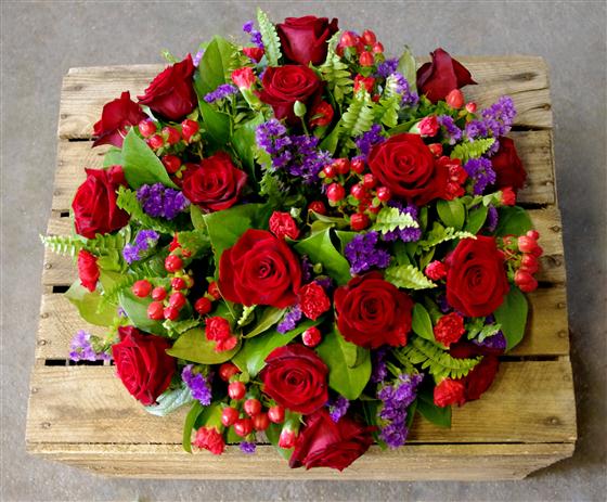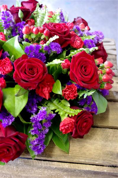 An all round posy arrangement of deep red roses, spray carnations and hypericum berries mixed with vibrant purple statice and lisianthus.